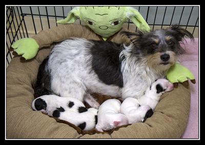 Sasha has the ears of a papillion and a terrier coat. She was called a Terrier-Mix when we adopted her from a Los Angeles shelter. She was pregnant with five puppies all of which looked like short haired Jack Russell Terriers with no feathering on their ears...
