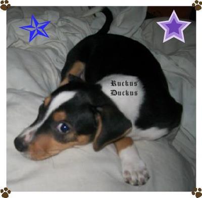 This is my JRT, "Ruckus"...(and believe me, his name TOTALLY fits him!) He is also known as "Ruckus Duckus", "Ruckaduck" and "Ruckaduckadoo"...(as in, "Rucka-ducka-doo, I LOVE YOU!" :) His age is about a year and a half now, and I look forward to many, MANY more years with him! Best dog I ever had!