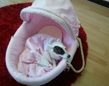 Penny is my adorable tiney Jack Russel,who is 7 yrs old. Her legs are only 2inch tall,and her tail is 1inch long. She gose everywere with me. She has her own babies crib with a sleeping bag in it for bed. She covers her eyes up with her paws at night too.